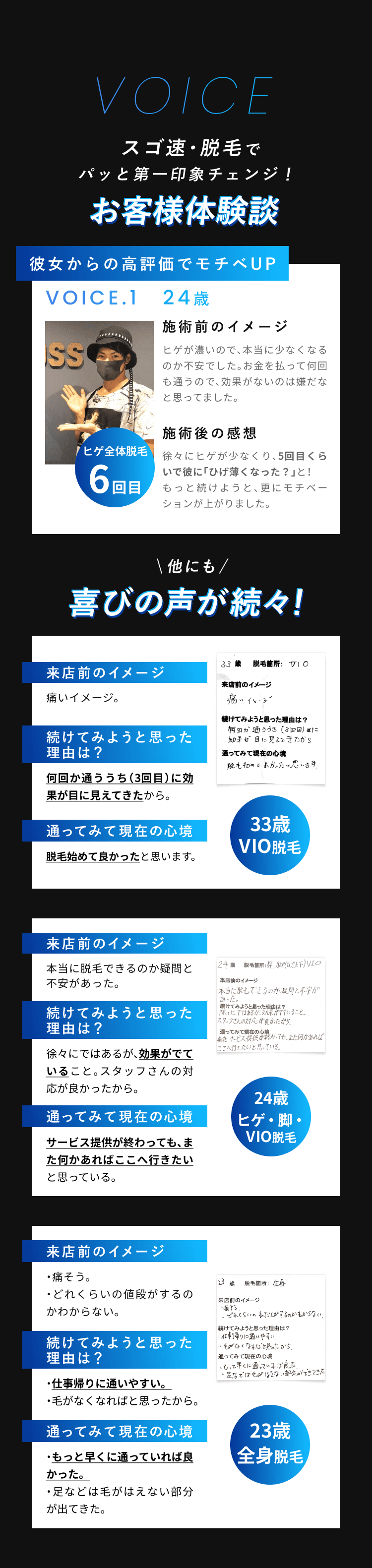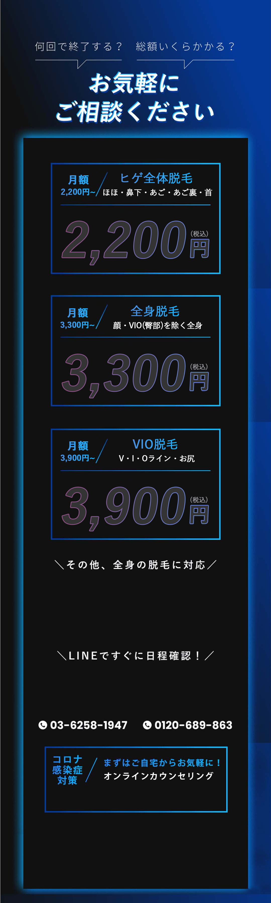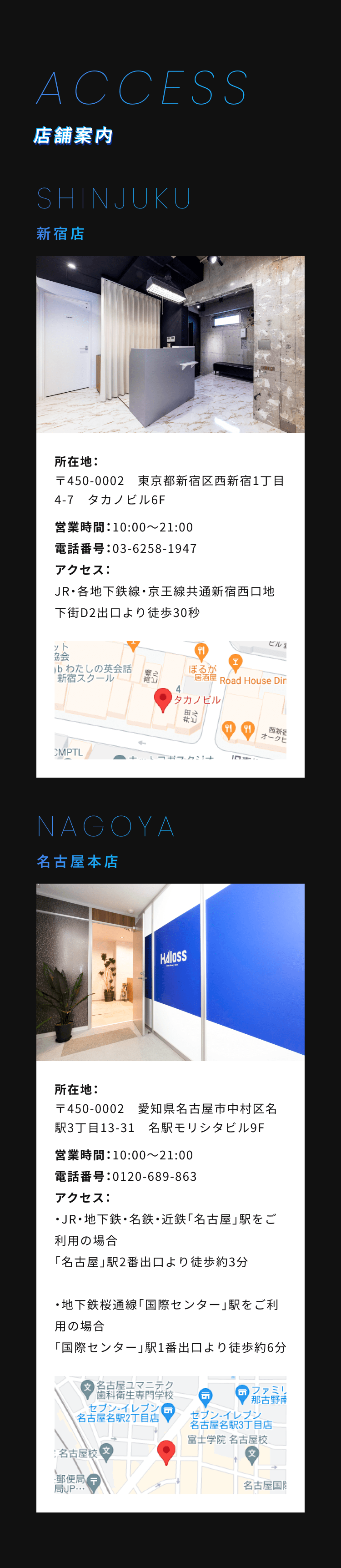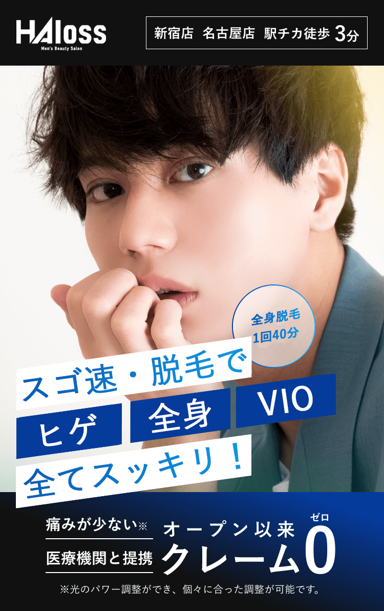脱毛体験お申し込みフォーム 希望店舗選択必須 新宿店 名古屋本店 お名前必須 氏名 ふりがな 年齢必須 歳 メールアドレス必須 お電話番号必須 ご連絡の取りやすい番号をご入力ください。ハイフン「-」は不要です。 体験内容必須 オンラインカウンセリング 全顔ヒゲ脱毛 ヒゲ脱毛+VIO ヒゲ脱毛+足脱毛 第一予約希望日必須 予約時間10:00〜11:0011:00〜12:0012:00〜13:0013:00〜14:0014:00〜15:0015:00〜16:0016:00〜17:0017:00〜18:0018:00〜19:0019:00〜20:0020:00〜21:00 第二予約希望日 予約時間10:00〜11:0011:00〜12:0012:00〜13:0013:00〜14:0014:00〜15:0015:00〜16:0016:00〜17:0017:00〜18:0018:00〜19:0019:00〜20:0020:00〜21:00 第三予約希望日 予約時間10:00〜11:0011:00〜12:0012:00〜13:0013:00〜14:0014:00〜15:0015:00〜16:0016:00〜17:0017:00〜18:0018:00〜19:0019:00〜20:0020:00〜21:00 ご質問・ご要望等 個人情報保護方針 当サロンは、プライバシーを尊重すべき重要なものとして認識しており、ホームページご利用の際にご提供いただくお客さまの個人情報を慎重に取り扱い、プライバシーの保護に努めております。個人情報の取り扱いに関しては、個人情報保護方針に従っております。 1.利用目的について ・ホームページからのご予約の受付、お問い合わせに対する対応のため。・事務管理を適切に行うため。・個人情報の開示、内容の訂正、追加又は削除、利用の停止、消去及び第三者への提供の停止等の意思確認、また、その申請に対応するために利用します。※以上の目的以外で利用者さまの情報を利用する場合、利用者さまご本人に個別理由を説明し、同意を得た上で行うものといたします。ただし、緊急の場合、施術のため必要な場合等、当サロンが必要だと判断した場合は利用を優先し、後ほど説明させていただきます。 2.個人情報の第三者提供について 当サロンは、利用者さまよりお預かりした個人情報を適切に管理し、次のいずれかに該当する場合を除き、個人情報を第三者に開示、提供いたしません。 ・法令に基づく場合。 ・人の生命、身体又は財産の保護のために必要がある場合であって、本人の同意を得ることが困難な場合。 ・公衆衛生の向上又は児童の健全な育成の推進のために特に必要がある場合であって、本人の同意を得ることが困難である場合。 ・国の機関若しくは地方公共団体又はその委託を受けた者が法令の定める事務を遂行するに対して協力する必要がある場合であって、本人の同意を得ることによって当該事務の遂行に支障を及ぼすおそれがある場合。 3.セキュリティについて 個人情報保護のためのセキュリティとしてSSL(Secure Sockets Layer)というデータ暗号化技術を使用しております。 4.容易に認識出来ない方法による取得について CookieやWeb beacon等、個人情報を収集されていると容易に認識できない方法によって、利用者さまの個人情報を収集することはありません。 5.個人情報の委託について 検体、検査等のため他機関へ業務委託する場合などは、当該機関から機密保持に関する誓約書を取得し、個人情報の保護に努めます。 6.個人情報の開示、訂正、追加、削除、利用、提供の拒否について 当サロンへご提出いただいた個人情報については、開示、訂正、追加、提供の拒否等の要求が出来ます。詳しくは下記個人情報管理係までご連絡ください。 メンズ脱毛専門店 HAloss〒450-0002愛知県名古屋市中村区名駅3丁目13-31 名駅モリシタビル 9F TEL:0120-689-863 個人情報保護方針・プライバシーポリシーに同意します。
